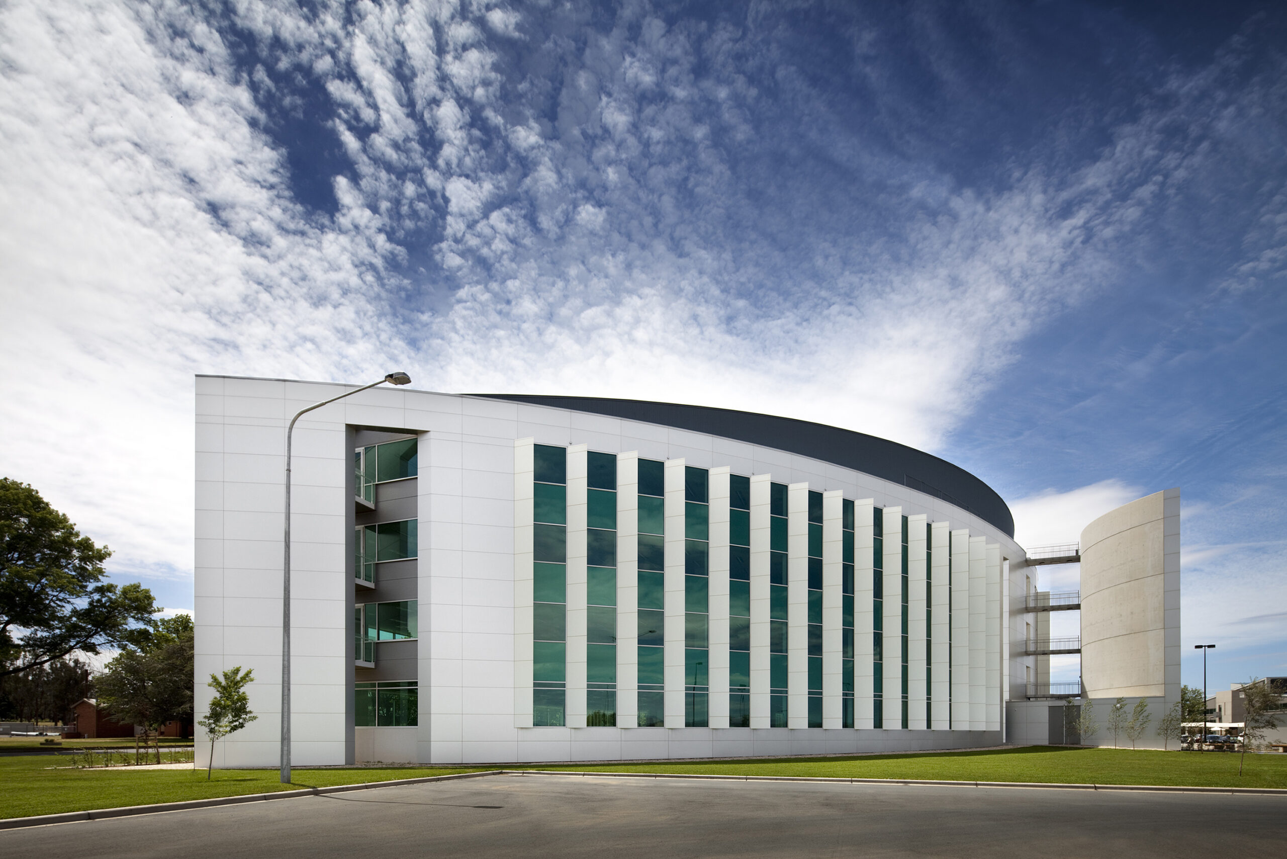A key criterion for the proprietor was to create a form that has a clear presence in the distant view from the new airport terminal. The simple form of the large curved façade and curved stair wall create a clear legibility that sets the context for a future adjacent building.
