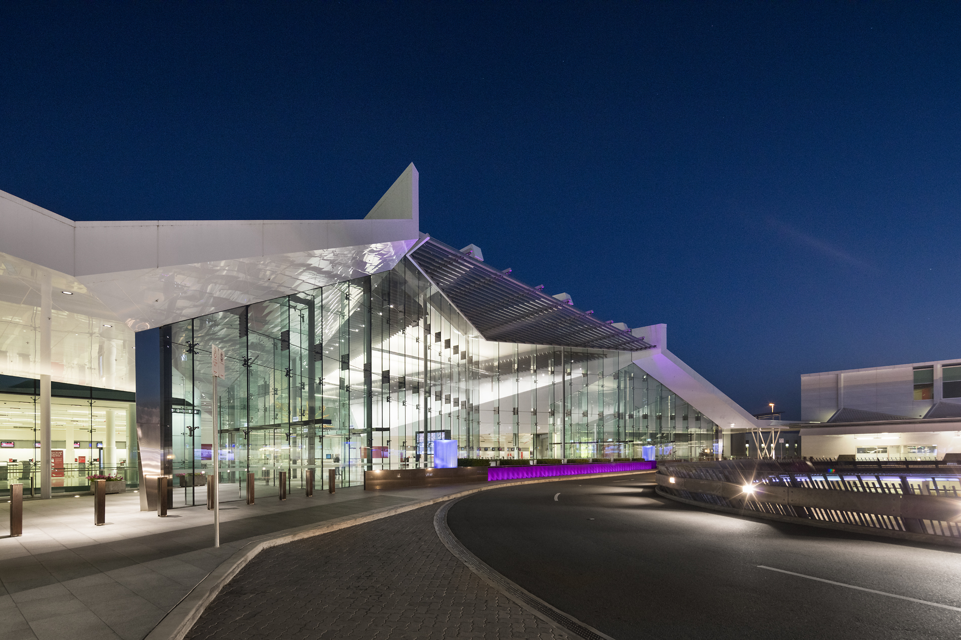 The new passenger terminal, built in two phases on the original airport footprint, is flanked and framed by two 1200 vehicle carparks, and upper level office facilities. A central atrium directly interconnects all of the various activities of the departure level and the three-storey glazed structure presents an iconic entrance image as viewed from the passing highway and the axial landscaped approach road. The new upper level road arrives at two covered drop-offs allowing pedestrian movement to the terminal free of traffic conflicts. Two landscape courtyards provide welcoming spaces immediately adjacent to arrivals waiting and baggage claim. Significant works of art are integrated into the complex.